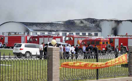 2013 年6 月3 日,吉林省德惠市一家禽业公司发生火灾,到上午10 时火势基本被控制住,但现场仍有大量浓烟冒出。摄影/ 张瑶