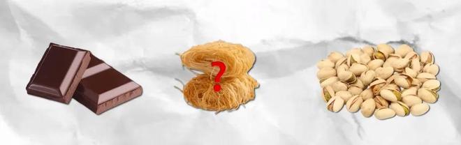 这款夹心巧克力的主要原料如下:巧克力、开心果,以及中间这个细长成卷的东西。看起来脆脆的,有点像北方的馓子。